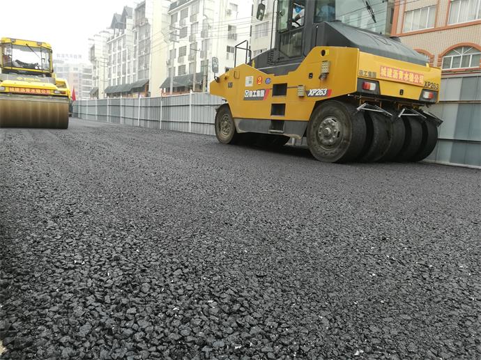 圖為機動(dòng)車(chē)道粗粒式瀝青調平層攤鋪施工及光輪壓路機初壓現場(chǎng)