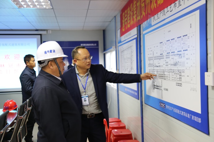市長(cháng)林冠聽(tīng)取賀州通號裝配式建筑有限公司董事長(cháng)劉豐收介紹PC生產(chǎn)線(xiàn)布局及工藝流程情況
