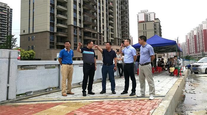 朱義芳(左三)、陳桂軍(右二)、蘭乾雄(右一)在平安東路項目現場(chǎng)調研