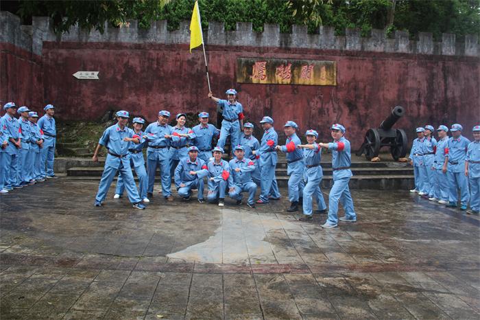 經(jīng)過(guò)一路爬涉,我們終于到達了紅七軍廣場(chǎng)。廣場(chǎng)足有兩個(gè)球場(chǎng)寬大,廣場(chǎng)的背景是一幅紅七軍的巨型浮雕,“鷹揚關(guān)”三個(gè)大字蒼勁有力赫然其中,兩門(mén)古炮架設兩旁蔚為壯觀(guān)。據教官介紹,這里就是湘、桂、粵三省交界處,號稱(chēng)“一腳踏三省”的地方。遙想當年,紅七軍就是在這里集結從廣西進(jìn)入廣東連山。