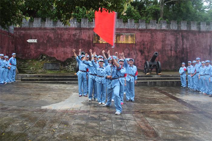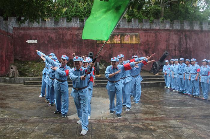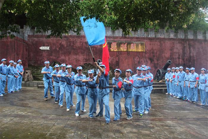 “七一”前夕,城投集團全體黨員身穿紅軍裝,頭戴紅軍帽,腰系紅軍帶,分乘兩部大巴,雄赳赳氣昂昂前往鷹揚關(guān)。
