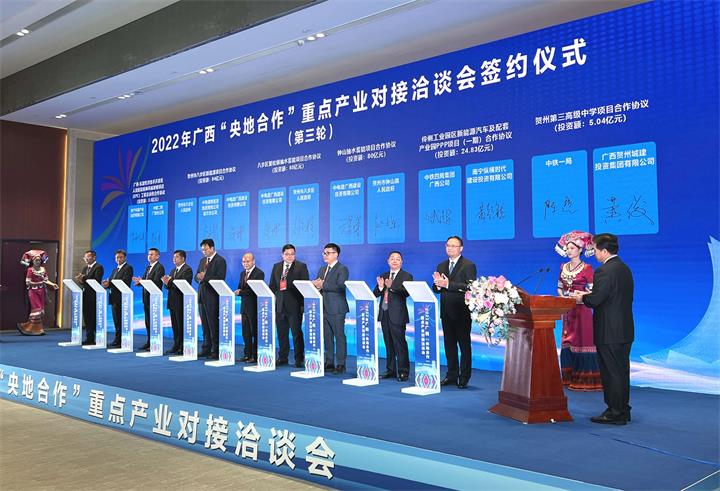 9月16日下午,廣西壯族自治區與中央企業(yè)2022年“央地合作”重點(diǎn)產(chǎn)業(yè)合作洽談會(huì )在南寧舉行,城投集團黨委書(shū)記、董事長(cháng)黃俊參加會(huì )議并代表賀州市屬?lài)衅髽I(yè)與中央企業(yè)簽約。