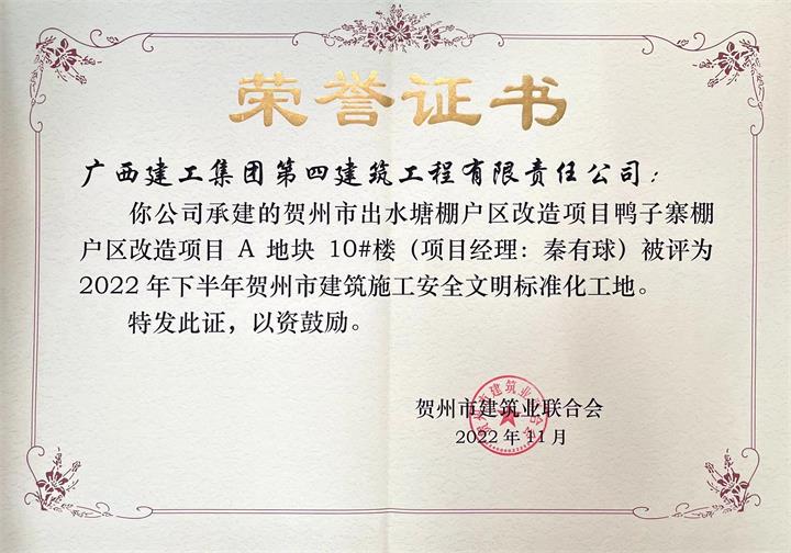 打造“高標準”文明工地。以標準化制度為主線(xiàn),實(shí)現人員“進(jìn)場(chǎng)流程、安全檢查、安全設施、安全防護”標準化,建立13個(gè)在建項目微信交流群,每日報送項目建設情況,全方位推進(jìn)文明工地建設。公司實(shí)施的平安居棚改項目、出水塘鴨子寨棚改項目均榮獲“2022年下半年賀州市建設工程施工安全文明標準化工地”。