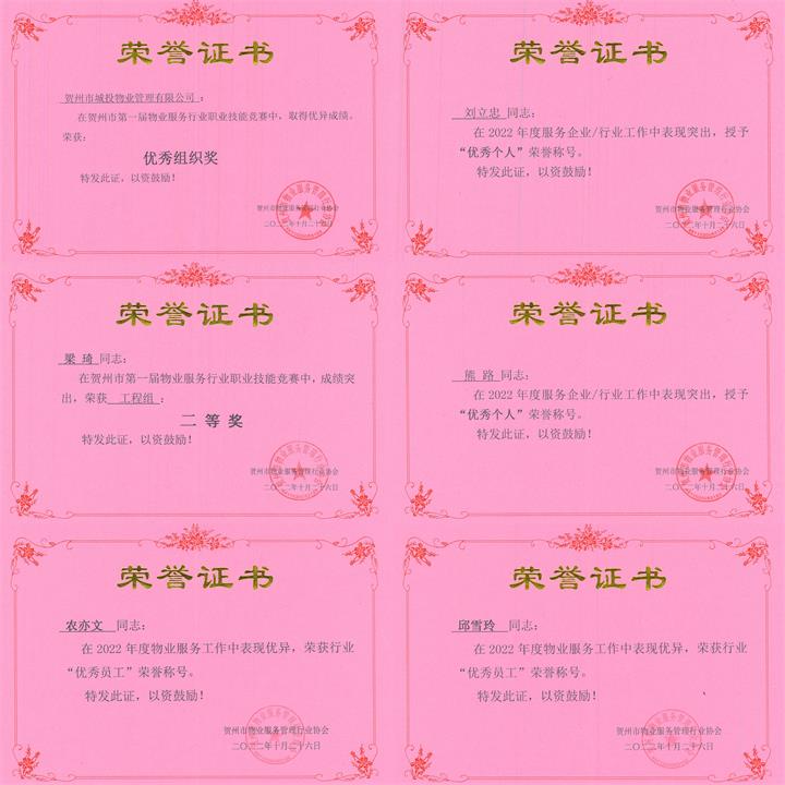 社會(huì )形象好,踐行國企擔當。2020—2022年疫情期間,堅持黨員沖鋒在疫情防控一線(xiàn),按照賀州市統一部署,通過(guò)集中培訓、精準調度、合理安排輪值輪守等舉措,組織全體員工按照疫情防控最新要求落實(shí)無(wú)縫隙、全覆蓋出入登記、體溫測量、專(zhuān)業(yè)消殺等舉措,充分發(fā)揮黨員先鋒模范帶頭作用,順利實(shí)現了所管理的城投.東苑、城東新區公租房、人才公寓、樂(lè )居家園、城投集團辦公樓及老陶瓷廠(chǎng)三無(wú)小區,所負責的太白社區“零感染”目標,為賀州市疫情防控做出了應有貢獻。2021年榮獲賀州市物業(yè)服務(wù)管理行業(yè)協(xié)會(huì )授予“抗擊新冠肺炎疫情優(yōu)秀企業(yè)”稱(chēng)號、集團公司黨委授予2020-2021年度“優(yōu)秀黨員先鋒崗”榮譽(yù)。